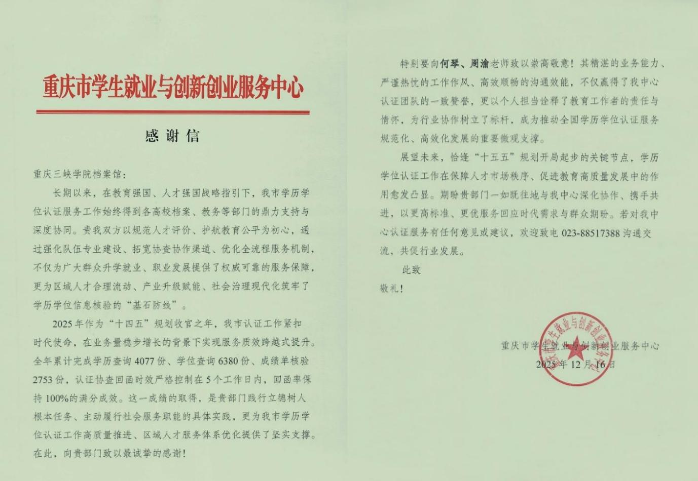 重庆市学生就业与创新创业服务中心致函感谢学校档案馆